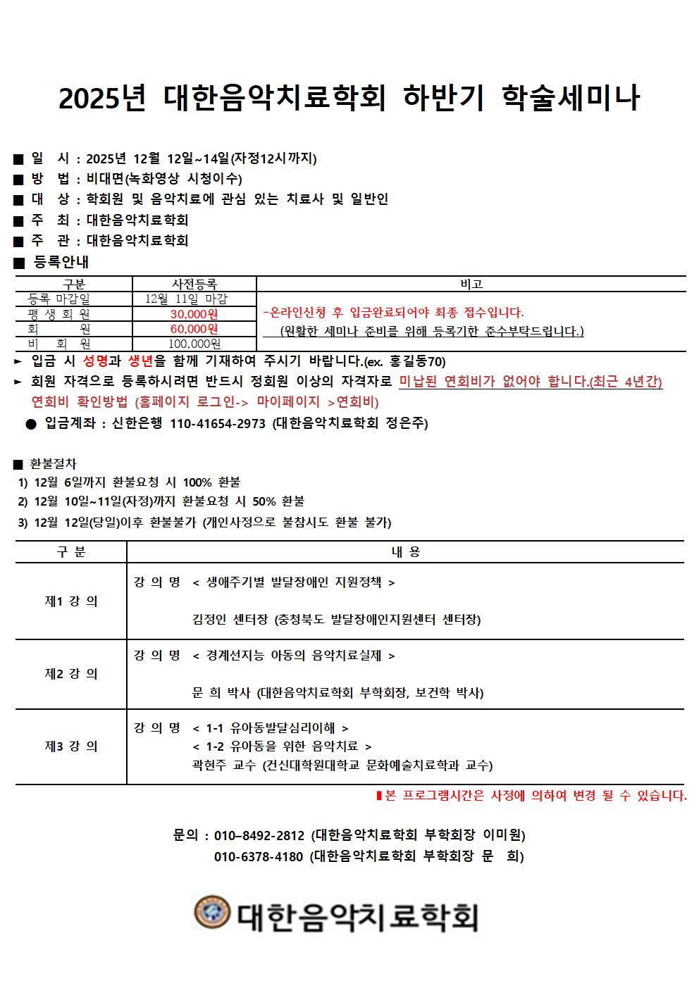 * "온라인신청 접수"를 클릭하시어 신청하세요. * 회원 자격증갱신에 필요한 이수시간(52시간) 충족여부를 꼭 확인하세요~ (갱신에 필요한 보수교육 이수시간이 미달시, 갱신이 어려울 수 있습니다.) * "12월 12일 ~ 14일까지 영상시청"하시면 세미나 이수처리 됩니다. * 영상 관련 링크는 "12일 오전에 문자"로 발송해드립니다. * 세미나 참가비 외 입금 표시예시 (ex. 홍길동연회비, 홍길동가입비) (온라인신청 접수)