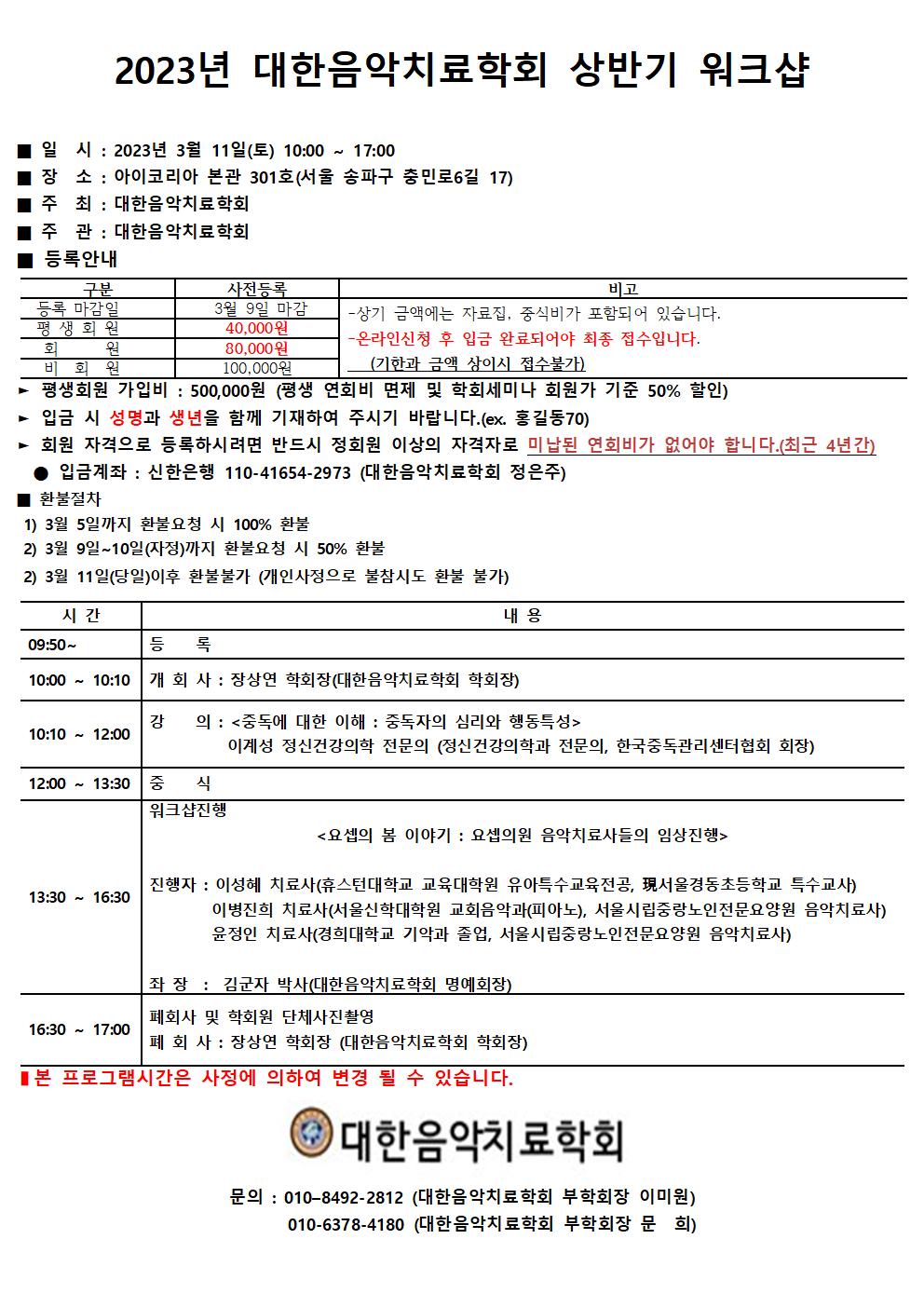 안내사항으로 1. 아래의 온라인 신청를 클릭하시고 작성하신 후 '제출'까지 눌러주시면 신청은 완료됩니다. - 별도의 접수완료 안내를 드리지 않습니다. 2. 보수교육 세미나 이수시간은 8시간이며, 홈페이지 가입을 꼭 하셔야 '세미나이수증'을 받으실 수 있습니다. 대한음악치료학회에서는 2023년 상반기 워크샵을 개최합니다.
